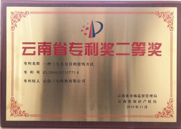 按照《云南省市場監(jiān)督管理局關(guān)于評選2019年云南省專利獎的通知》要求,我公司積極參與申報評選,選取發(fā)明專利“一種三七總皂苷的提純方法(ZL200810233775.8)”為參評專利進行申報。依據(jù)《云南省專利獎獎勵辦法》(云市監(jiān)規(guī)〔2019〕1號)的規(guī)定,經(jīng)文山州市場監(jiān)督管理局推薦,云南省專利獎評審委員會評審,社會公示,云南省市場監(jiān)督管理局黨組會議審定等系列程序。根據(jù)《云南省市場監(jiān)督管理局關(guān)于2019年云南省專利獎授獎的決定》(云市監(jiān)辦發(fā)〔2019〕160號),該專利被授予2019年云南省專利獎二等獎。