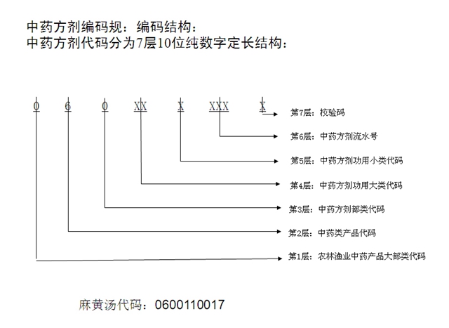 本標準由中藥方劑編碼規則和編碼構成,中藥方劑編碼規則為通用標準,采用7層共10位阿拉伯數字來表達中藥方劑的身份信息;方劑的具體編碼為專業標準。它是以阿拉伯數字編碼,以編碼數字傳輸,表達中藥方劑信息信號的電子信息化編碼體系。其特點,簡短、安全、傳輸準確。