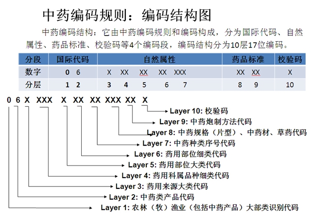 中藥編碼規則的結構,是以10層結構,17位阿拉伯數字作為編碼,每一層都有編碼依據,包含了科學屬性、商品屬性、專業屬性和藥用屬性,并與國際標準的編碼規則及其結構相銜接,保持一致,具有唯一性、穩定性、兼容性和可擴展性,兼容將來新增的中藥品種的編碼。